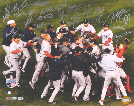 A unique collectible gift ... a celebration photo after the Boston Red Sox won the 2007 World Series on October 29, 2007. This Photo feature 22 Red Sox player / coach autographs signed in Silver marker.