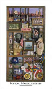 A variety of Boston memorabilia is artfully arranged in a wooden box to form a unique pictorial of life in the New England City, past and present. The print takes the viewer on a clever behind the scenes tour of Boston.