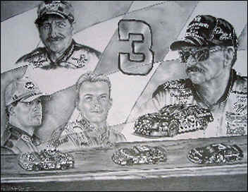 Artwork reproduction featuring Dale Earnhardt Sr., Dale Earnhardt Jr., and Michael Waltrip
